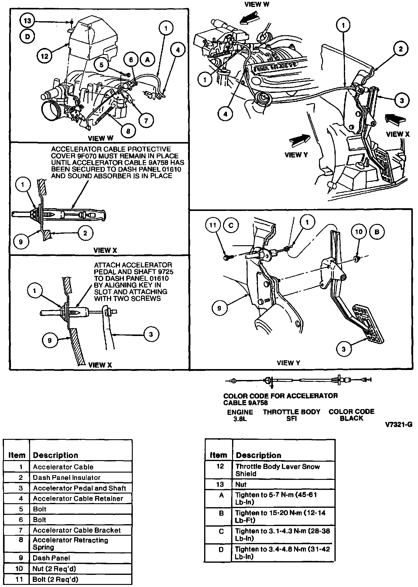 8. To install, reverse Removal procedure and make sure accelerator cable movement is not restricted. Tighten accelerator cable to accelerator cable mounting bracket retaining bolt to 5-7 Nm (45-61 lb in). Tighten throttle body lever snow shield nut to 3.4-4.8 Nm (31-42 lb in).