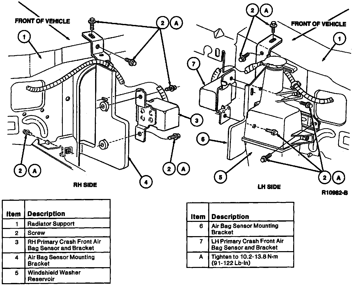 NOTE: Remove windshield washer reservoir before removing LH primary crash front air bag sensor and bracket retaining screws.
