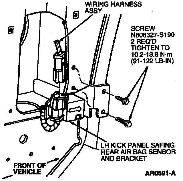 NOTE: To service stripped LH kick panel safing sensor retaining screws, replace old screws with 14 mm self-tapping screws. Tighten to 10.2-13.8 Nm (91-122 lb in).