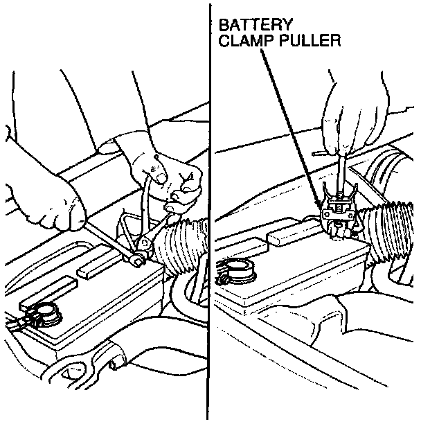 Use a clamp puller to remove a cable clamp from the battery terminal. With the jaws gripping the underside of the cable clamp, pull the clamp up by exerting pressure against the top of the battery terminal. Proper use of this tool avoids the damaging lateral or twisting forces that result when using a pry bar or pliers.