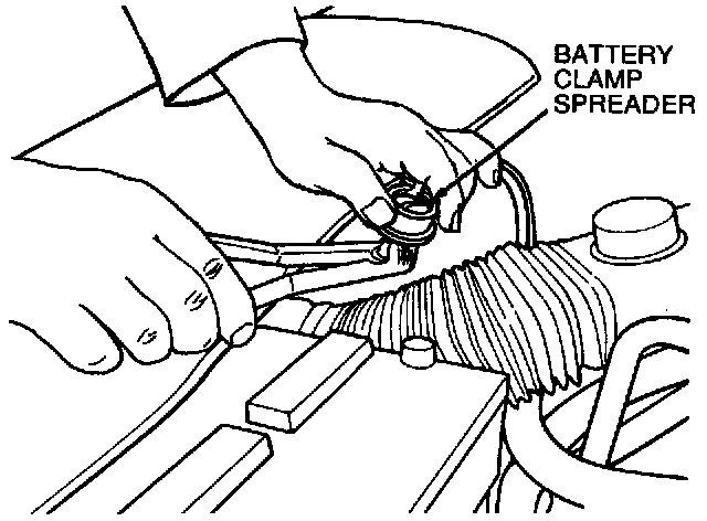 Battery pliers have specifically designed jaws for gripping cable clamp bolts securely. Care should be taken when removing or replacing the cable clamp bolts so the battery terminal is not subjected to any excessive lateral or twisting forces. Such forces could cause major damage to the internal components of the battery and cause leakage at the terminals.