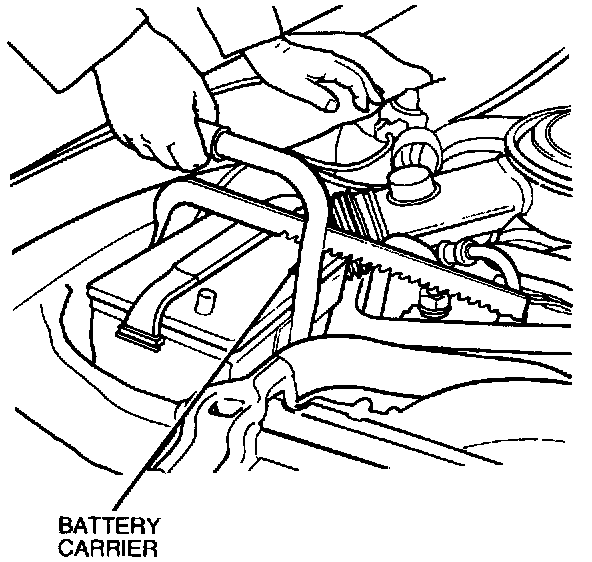 If required, use a suitable battery carrier for lifting and transporting the battery. The illustration shows a clamp-type carrier used to grip the sidewalls of the container just below the lip of the cover. The carrier is used on the sidewalls rather than the end walls, since the sidewalls have additional strength from the inner cell partitions. This is particularly important with the plastic-cased battery, which has flexible end walls.