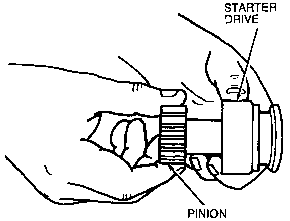 3. Turn the starter drive pinion by hand and hold the over running clutch. Replace the starter drive if the pinion turns in both directions or does not turn.