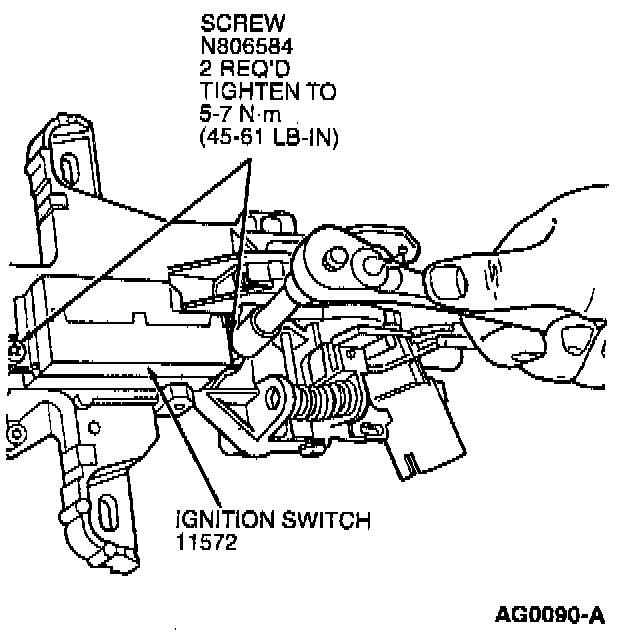 15. Install ignition switch. Align pin from ignition switch with slot in lock/column assembly. Position slot in lock/column assembly with index mark on casting. Tighten two retaining screws to 5-7 Nm (45-61 inch lbs.).
