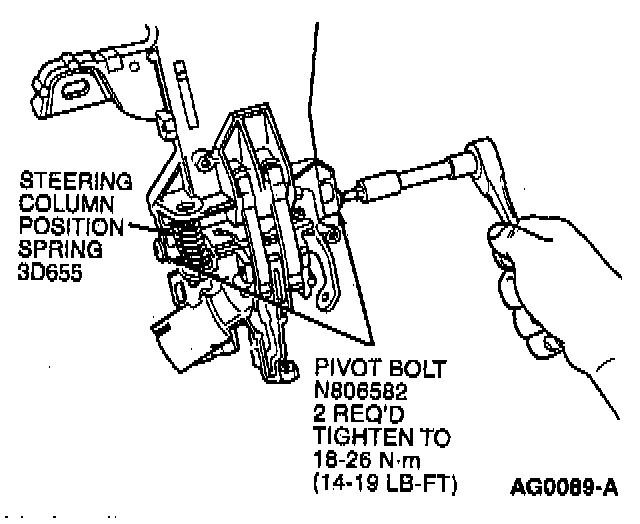 11. Position steering column position spring on steering column lock cylinder housing. With assistant, install steering column lock cylinder housing and pivot bolts. Tighten to 18-26 Nm (14-19 ft. lbs.).
