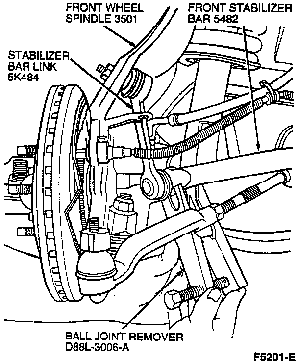 11. Remove stabilizer bar link from front stabilizer bar using Ball Joint Remover D88L-3006-A or equivalent.