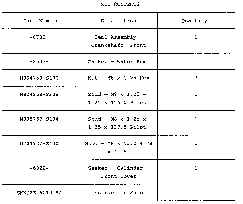 SERVICE KIT PART NUMBER: XU2Z-6020-AA