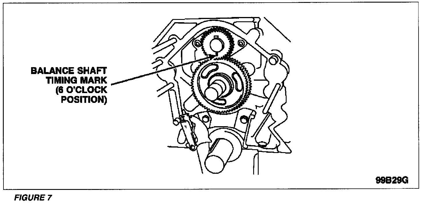 1. Install the timing chain tensioner. Tighten the retaining bolts to 8-14 Nm (6-10 lb-ft).2. Make sure the balance shaft timing mark is at the 6 o'clock position. See Figure 7.