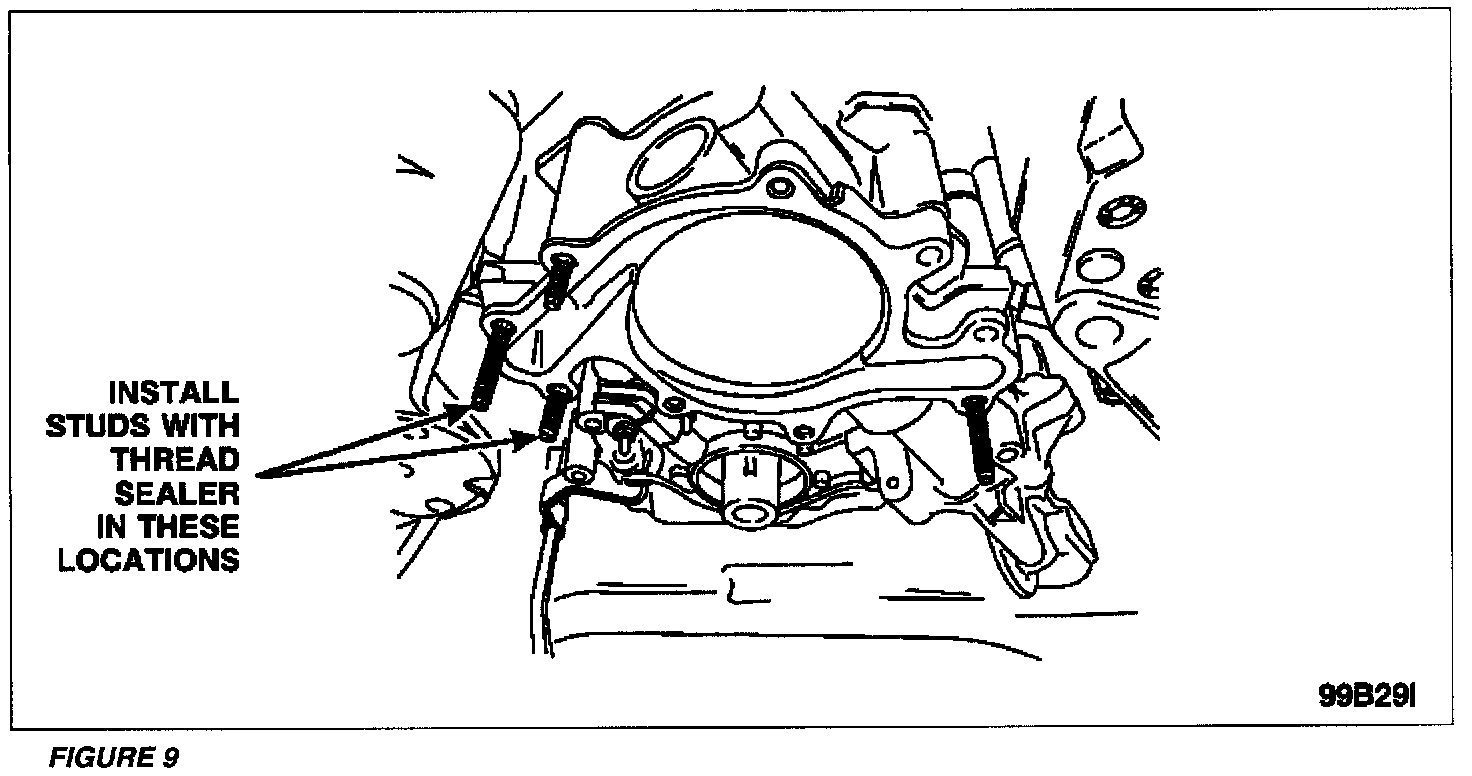 10. Install four (4) water pump studs in the locations shown in Figure 9. The two (2) studs with thread sealer must be installed in the proper positions. Using double nuts, tighten the studs to 7 Nm (62 lb-in). Remove the double nuts after the studs have been tightened.