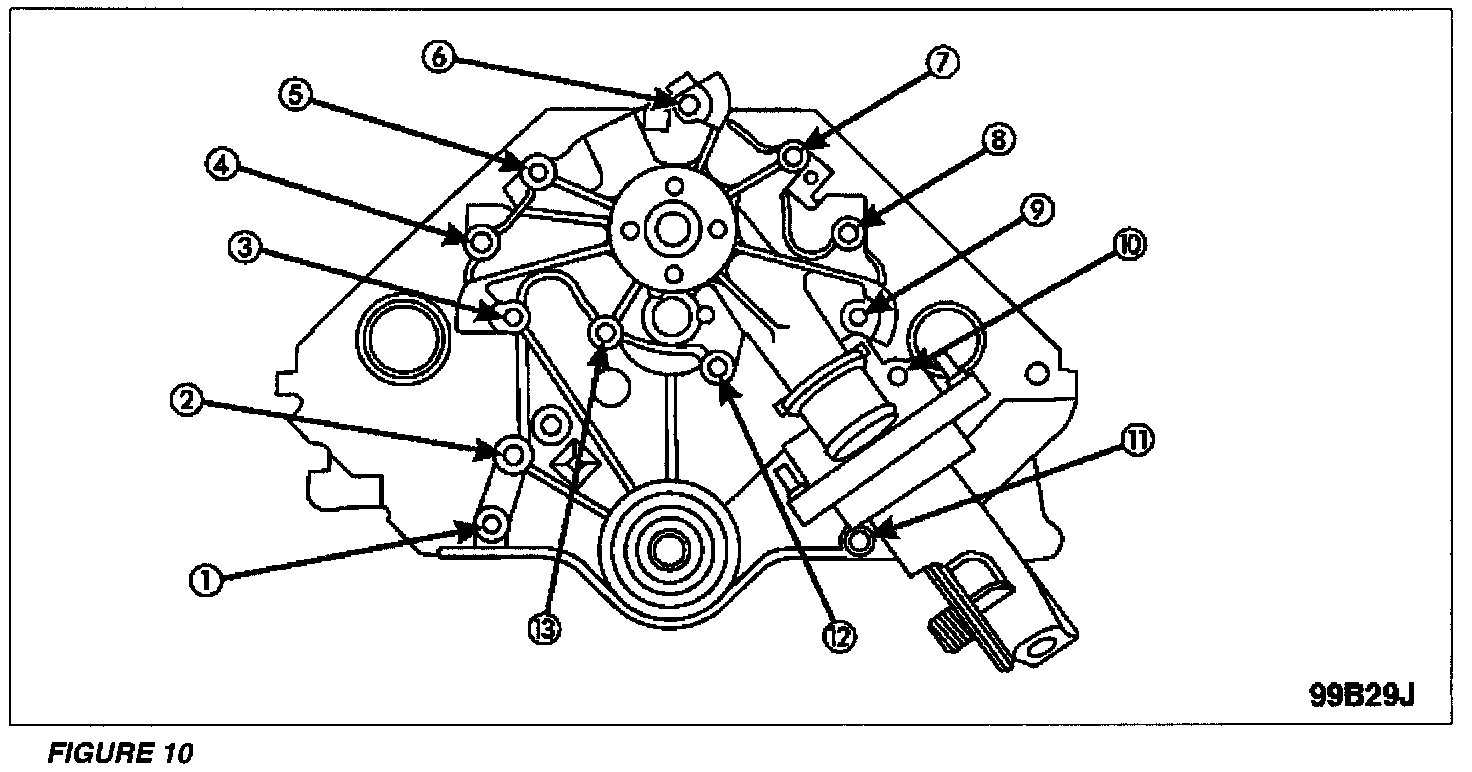 18. Tighten the front cover/water pump retainers in the sequence shown in Figure 10, to 28 Nm (20 lb-ft). Tighten the Allen head capscrew 11 to 22 Nm (16 lb-ft).