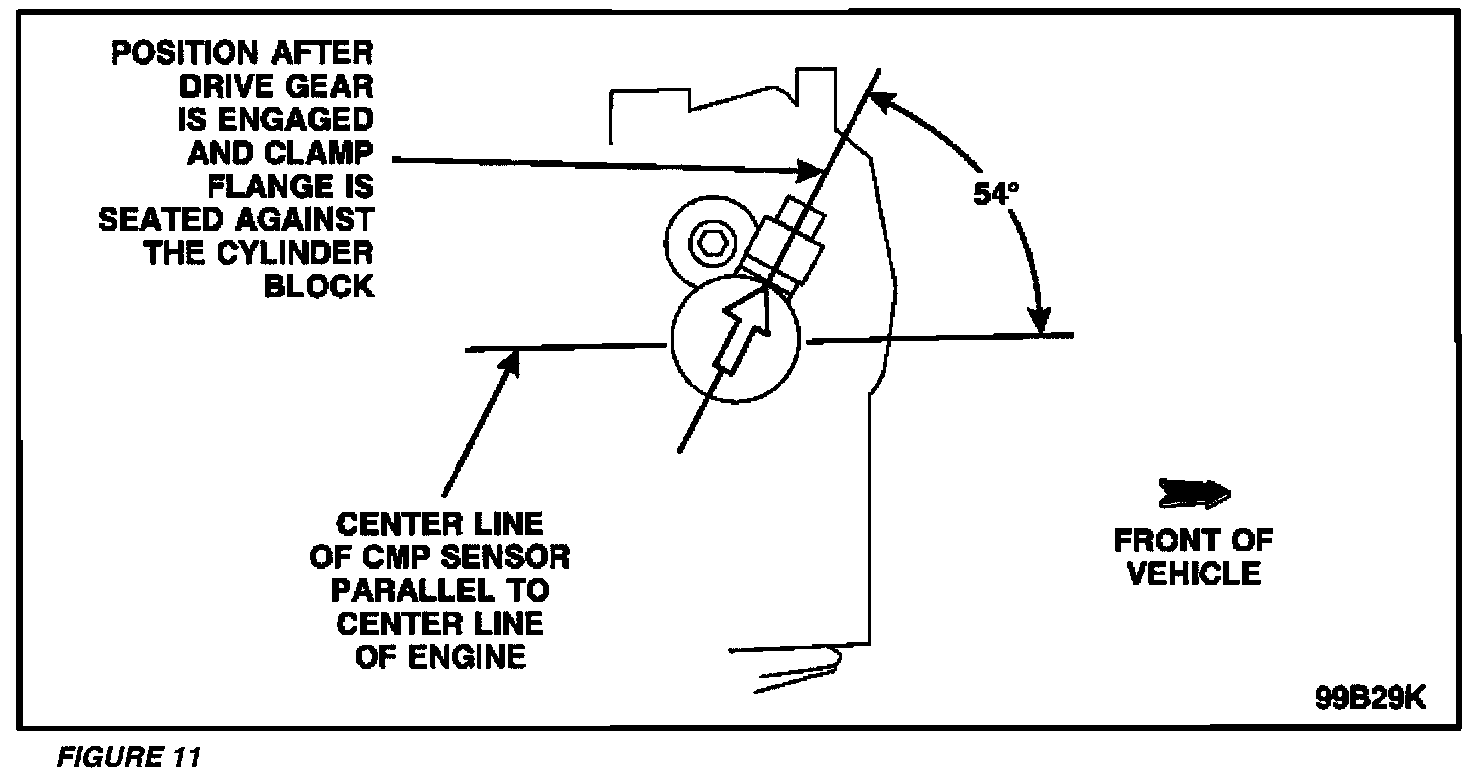 ^ Insert the camshaft synchronizer assembly in the front cover. Install the synchronizer assembly so that the arrow on the alignment tool is 54 degrees from the centerline of the engine. See Figure 11. This ensures that the CMP sensor electrical connector has proper clearance.