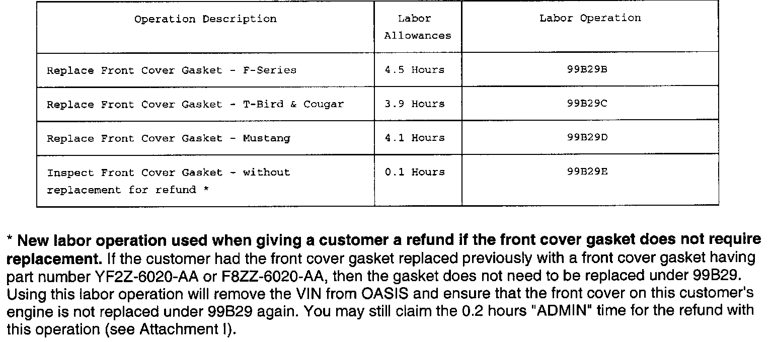 Care must be taken when removing the front cover to avoid damage (see cautions listed in Attachment III). If damage does occur, a new front cover has been released, F75Z-6019-AA. The new front cover comes without the oil pump. The oil pump from the damaged front cover must be transferred to the new front cover. CLEANLINESS IS EXTREMELY IMPORTANT when transferring the oil pump from a damaged front cover to the new front cover.