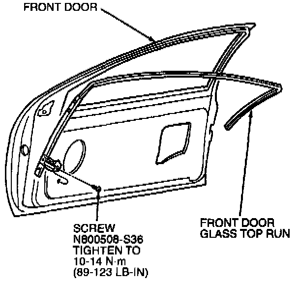8. Install front door glass top run to door inner panel with screw and washer assembly. Tighten to 10-14 Nm (89-123 Lb-In).