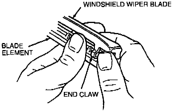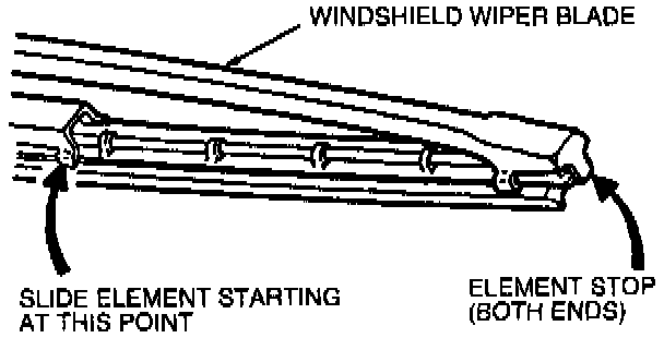1. Slide new wiper blade element into claws. Starting with second set from either end of windshield wiper blade. Slide blade element into all the claws to the element stop.