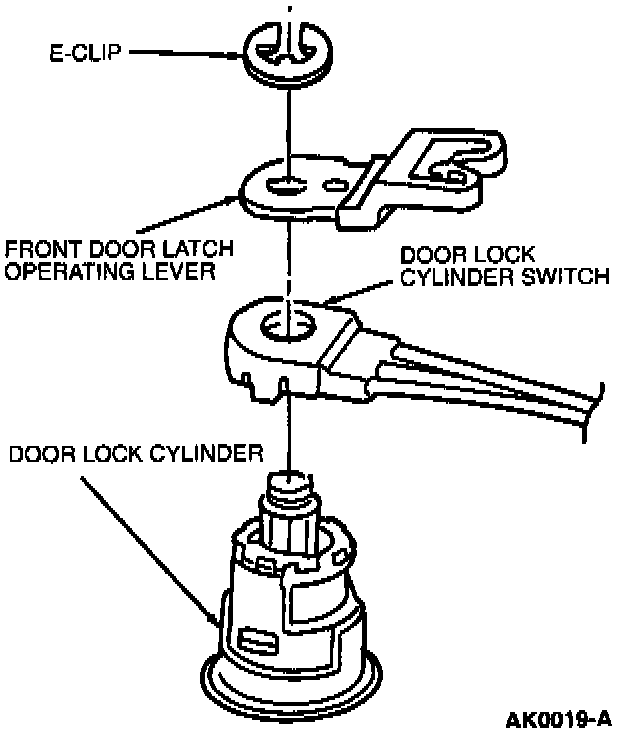 1. Install door lock cylinder switch, front door latch operating lever, and E-clip to door lock cylinder.