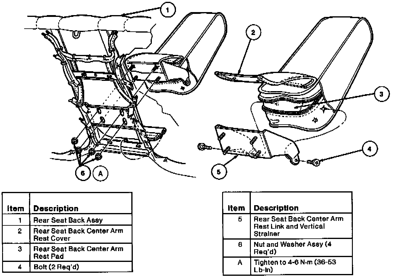 3. Assemble the center armrest to the rear seat back pad and frame. Install four vertical strainer-to-seat back retaining nuts. Tighten to 4-6 Nm (36-53 Lb-In).