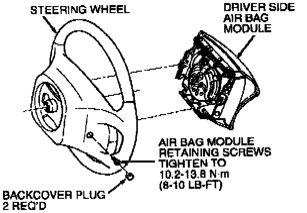 5. Install driver side air bag module on steering wheel and install two screw and washer assemblies. Tighten to 10.2-13.8 N.m (91-122 lb-in).