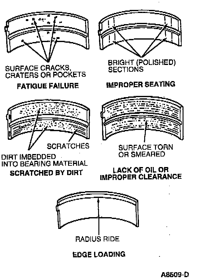 Inspect each bearing carefully. Replace bearings that have scored, chipped or worn surfaces. Typical examples of unsatisfactory bearings and their causes are shown in the illustration. The copper-lead bearing base may be visible through the bearing overlay. The bearing surface is aluminum. If the base showing is less than 20 percent of the total area, the bearing is not excessively worn. It is not necessary to replace the bearing if the bearing clearance is within recommended limits. Check the oil clearance of bearings that appear to be satisfactory with Plastigage D81L-6002-B or equivalent.