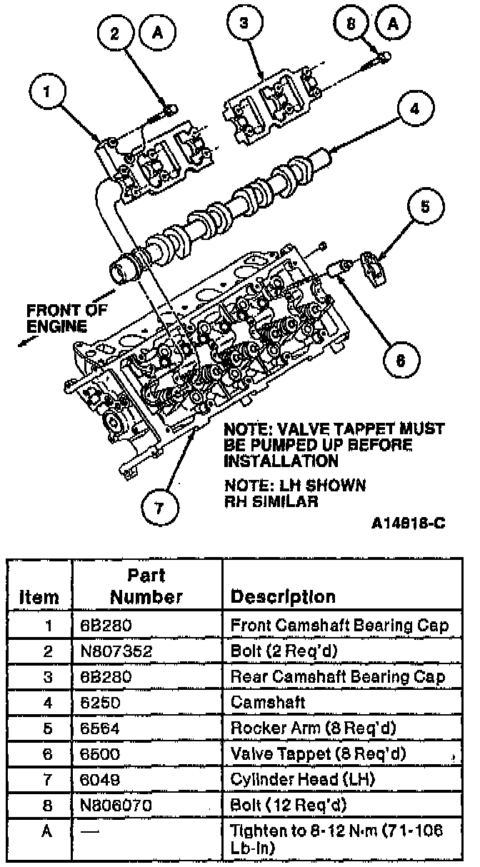 7. Remove 14 bolts retaining camshaft bearing caps (6B280) to cylinder head (6049).