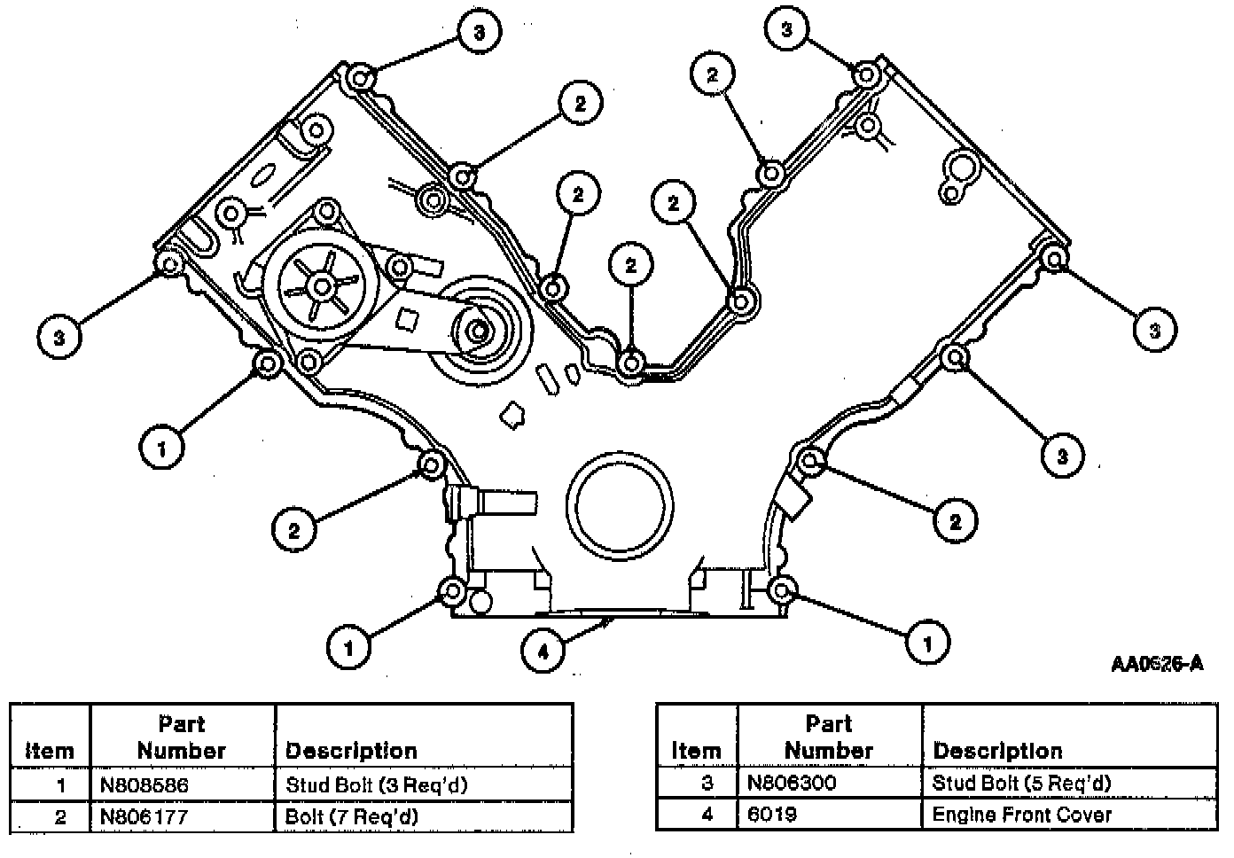 47. Remove eight stud bolts and seven bolts retaining engine front cover to engine. Remove engine from cover.