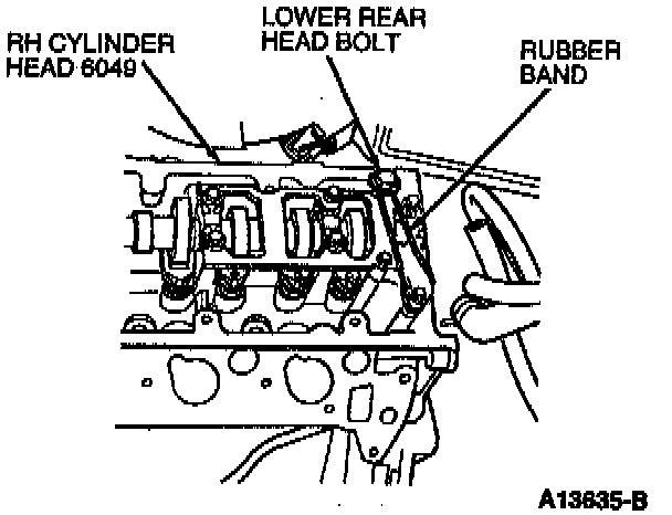 NOTE: The lower rear bolt cannot be removed due to interference with the A/C evaporator housing (19850). Use a rubber band or similar item to hold bolt away from cylinder blocks as shown in the illustration.