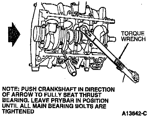 5. Push crankshaft forward using a prybar or similar tool to seat crankshaft thrust main bearing and crankshaft thrust washer.