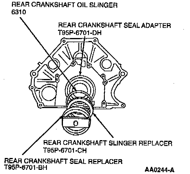 13. Using Rear Crankshaft Seal Replacer Adapters T95P-6701-BH, Rear Main Seal Replacer T95P-6701-DH and Rear Crankshaft Slinger Replacer T95P-6701-CH, install crankshaft rear oil seal (6701) and crankshaft oil slinger (6310).