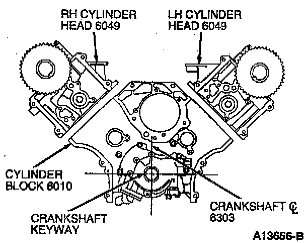 CAUTION: Failure to position crankshaft as shown will cause damage to pistons and/or valve train components.