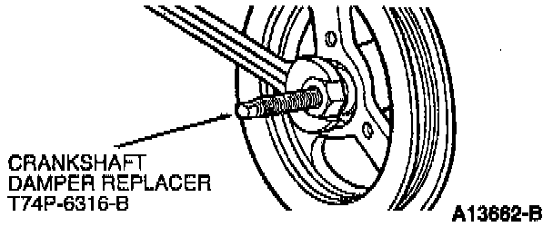 33. Install crankshaft pulley using Crankshaft Damper Replacer T74P-6316-B.