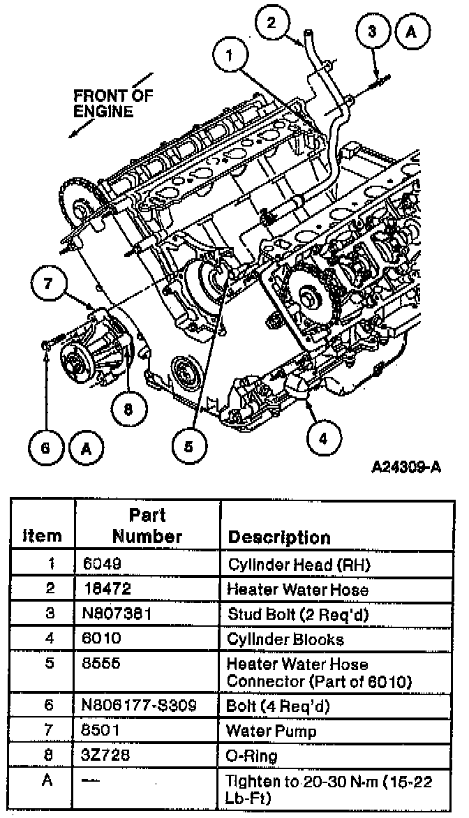30. Lubricate water pump housing gasket (8507) with Ford Premium Cooling System Fluid E2FZ-19549-AA (in Canada, Motorcraft CXC-8-B) or equivalent meeting Ford specification ESE-M97B44-A and install water pump and tighten retaining bolts to 20-30 Nm ( 15-22 ft. lbs.).
