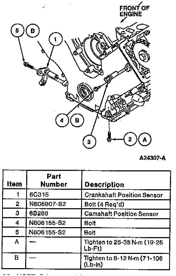 32. Install crankshaft position sensor (CKP sensor)(6C315) and camshaft position sensors into engine front cover and tighten retaining bolts to 8-12 Nm (71-106 inch lbs.).