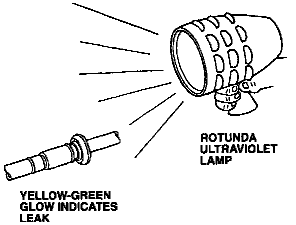 12. Using Rotunda Ultraviolet Lamp 164-R0721 or equivalent, check system for leaks. The tracer dye will glow a bright yellow/green when the ultraviolet light hits it.