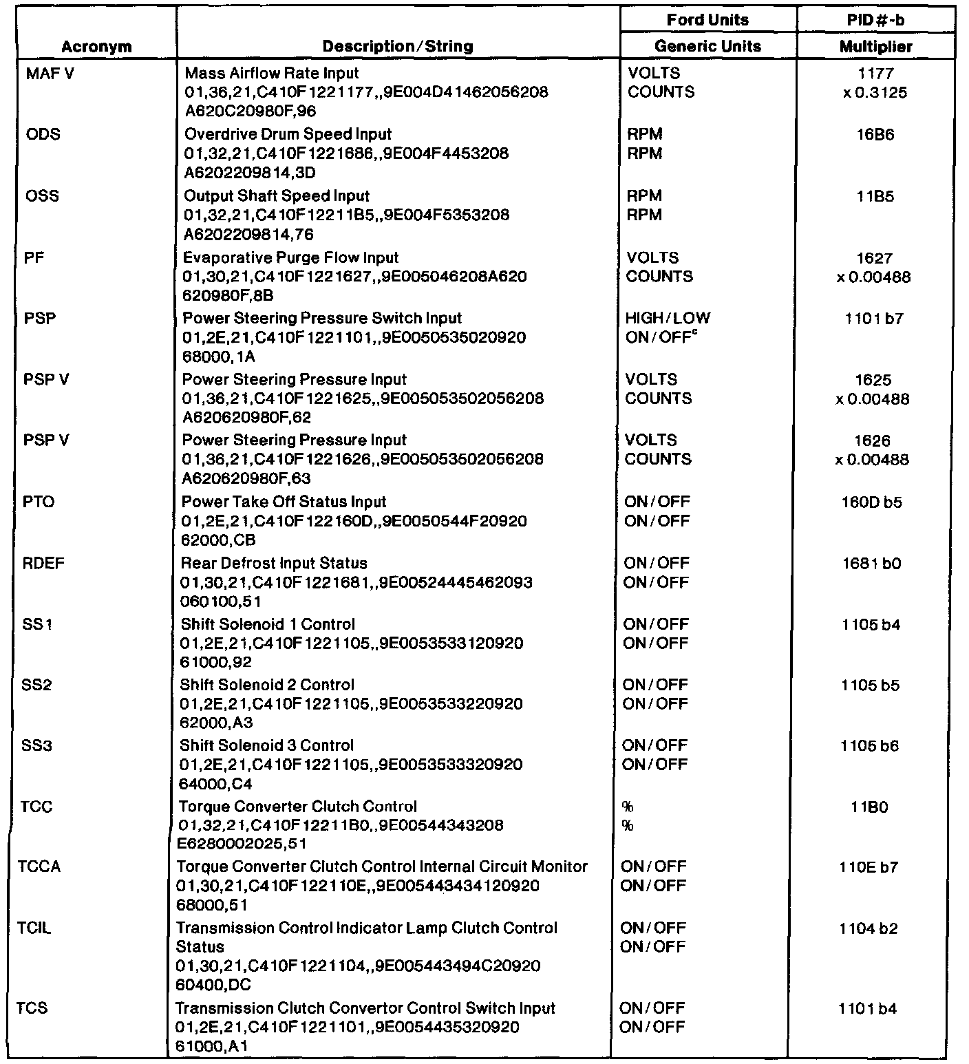 The Ford Parameter Identification (PID) list reflects only Ford manufacturer-specific PIDs used in the diagnostic procedures. The table lists the string of characters entered in a generic scan tool when accessing enhanced diagnostic PID information. When accessing these PIDs, the values will be continuously updated. For more information, refer to the Society of Automotive Engineers (SAE) J2205 document. Multiply the number of counts by the multiplier provided in the table for the proper conversion to Ford units.NOTE: Be sure the PID is supported by the vehicle strategy according to the pinpoint test step or the strings may display erroneous data.