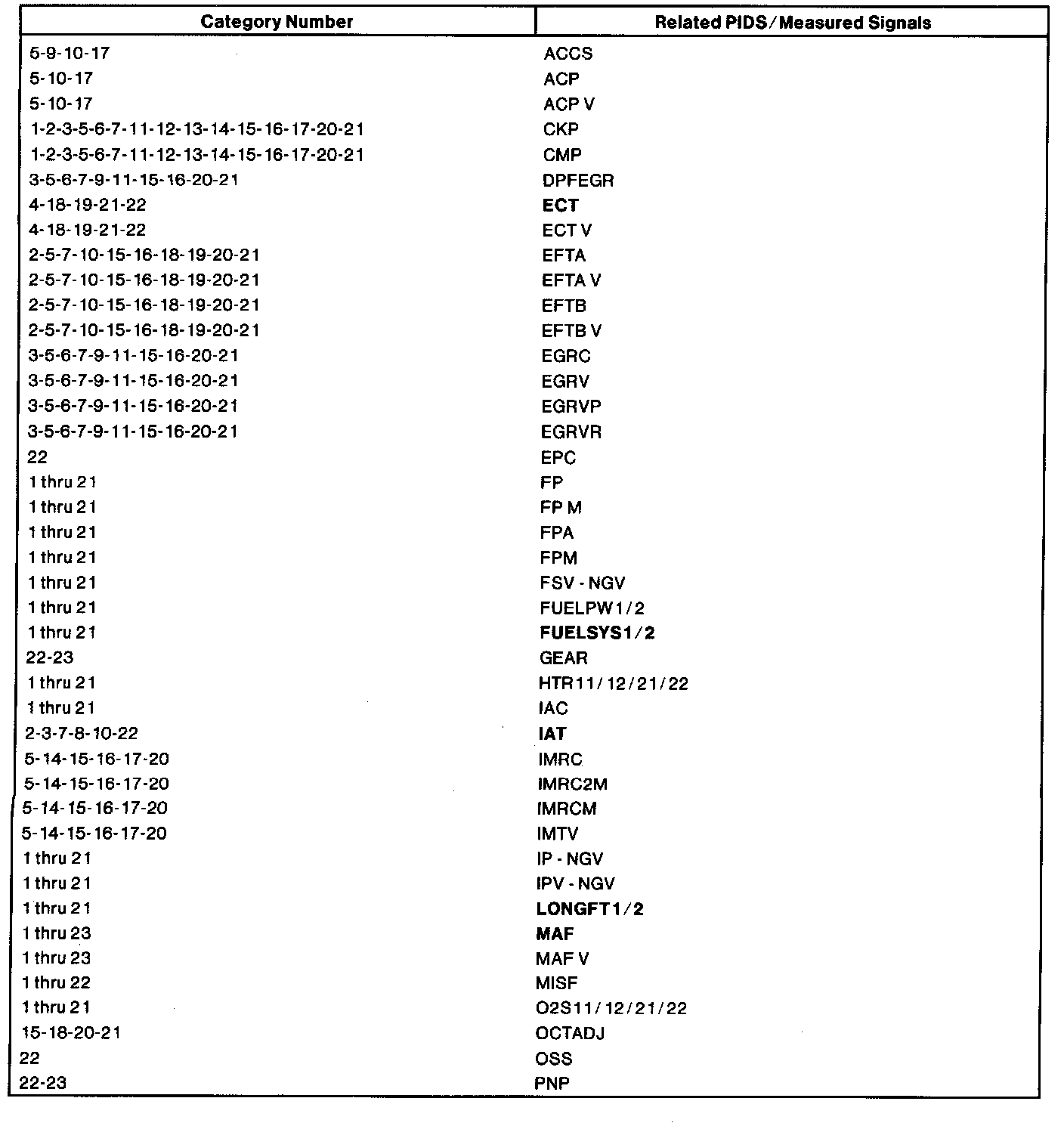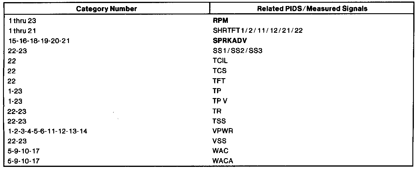The listing reflects PIDs and/or measured values which may reveal a possible concern within each system shown. Match the category number with the related PID/measured signal and proceed to the Typical Diagnostic Reference Value Charts.