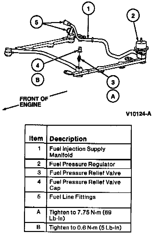 REMOVAL1. If fuel injection supply manifold is mounted to engine, remove fuel tank filler cap. Then release pressure from system at fuel pressure relief valve on fuel injection supply manifold using Fuel Pressure Gauge T80L-9974-B.