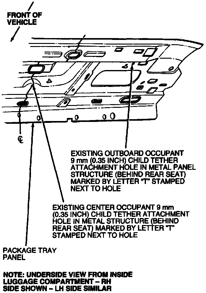 Three 9 mm (0.35-inch) diameter holes are provided in the rear window tray sheet metal structure for attaching the child safety belt anchor tether. For easy identification, these holes are stamped with the letter T next to the hole.