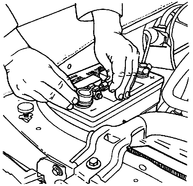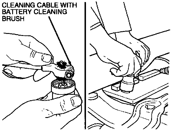 1. Clean cable terminals and battery hold down clamp with a wire brush. Replace all cables or parts that are worn or frayed.