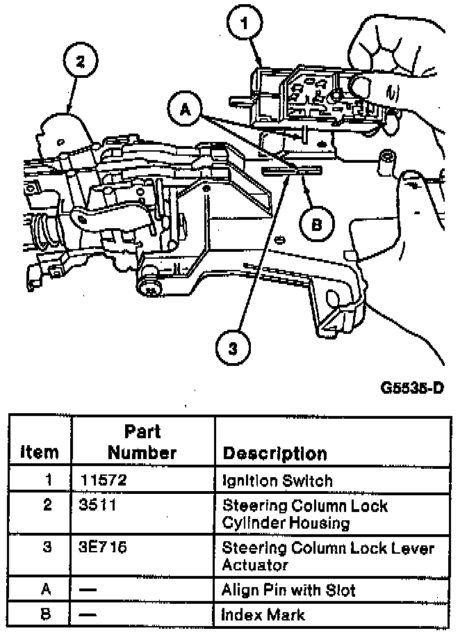 3. Install the ignition switch into the column actuator hole. It may be necessary to move the ignition switch slightly back and forth to align the ignition switch mounting holes with the lock cylinder housing threaded holes.