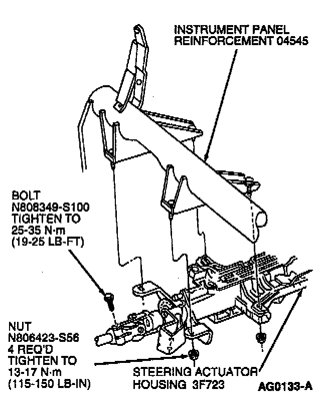 8. Remove two instrument panel reinforcement brace bolts. Remove reinforcement.