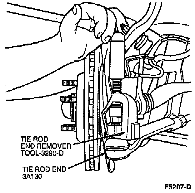 7. Remove tie rod end cotter pin and loosen castellated nut. Separate tie rod end from front wheel spindle using He Rod End Remover TOOL-3290-D or equivalent. Remove nut.