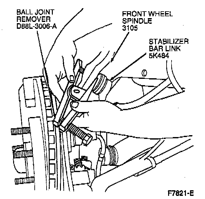 8. Remove stabilizer bar link at front wheel spindle using Ball Joint Remover D88L-3006-A or equivalent.