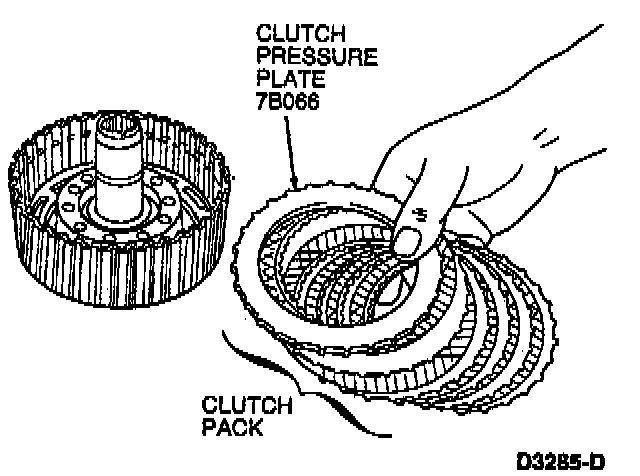 2. Remove clutch pressure plate retainer snap ring. Remove and inspect clutch pack. Note the relation of clutch pressure plates for assembly.