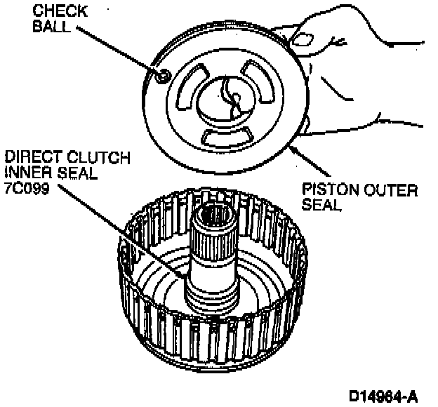 5. Remove direct clutch inner seal from direct clutch and outer seal from clutch piston. Verify presence of check ball and that it moves freely.