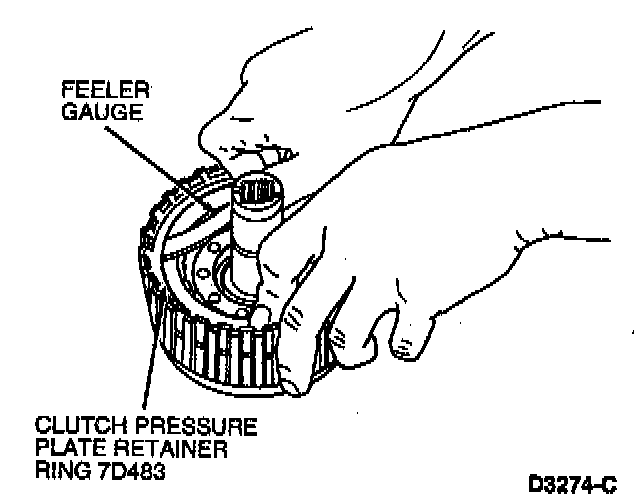 6. With clutch pressure plate retainer snap ring installed, check clearance between clutch pressure plate retainer snap ring and clutch pressure plate using a feeler gauge. Clutch pressure plate should be held downward as the clearance is checked.