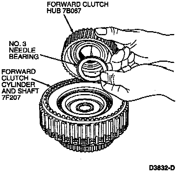 9. Install No. 3 forward clutch hub front bearing. Install forward clutch hub into forward clutch cylinder and shaft. Make sure forward clutch hub is against No. 3 forward clutch hub front bearing.