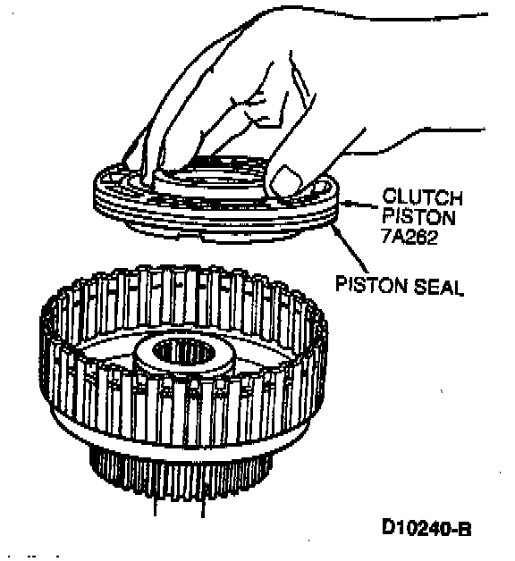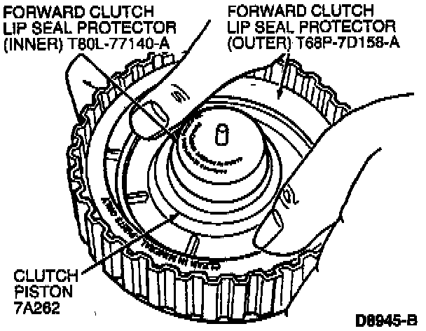 b. Install clutch piston in Forward Clutch Lip Seal Protector T68P-7D158-A.
