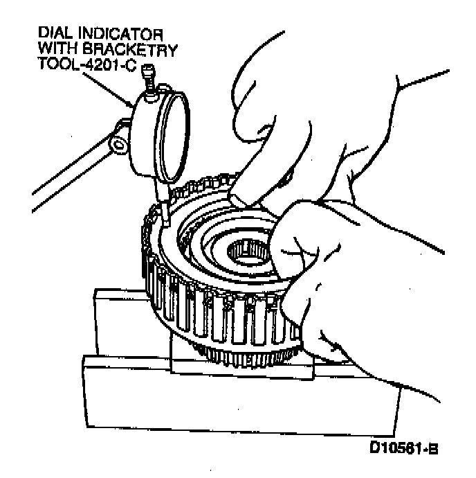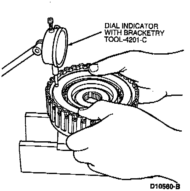 7. Install clutch pack clutch pressure plate retainer snap ring and check the clearance between the clutch pressure plate retainer snap ring and clutch pressure plate using Dial Indicator with Bracketry TOOL-4201-C or equivalent.