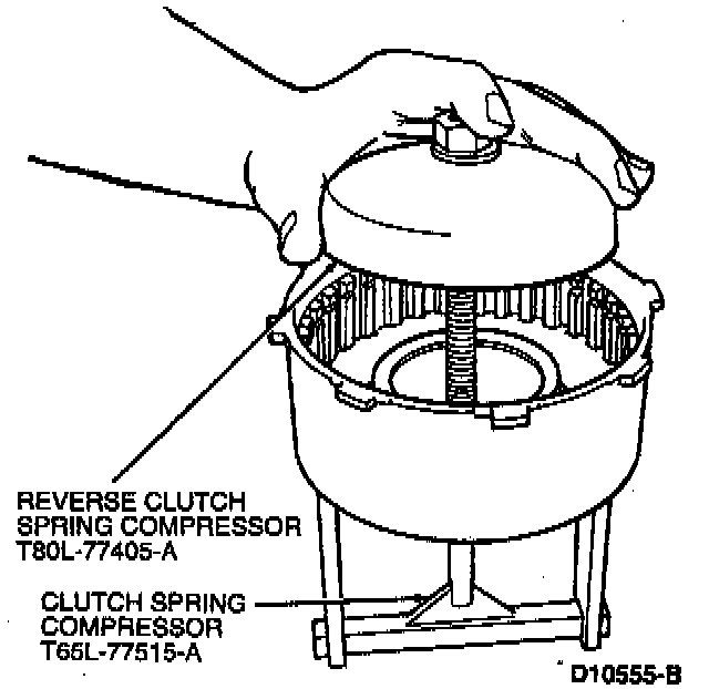 4. Install Reverse Clutch Spring Compressor T80L-77405-A and Clutch Spring Compressor T65L-77515-A onto reverse clutch drum. Tighten enough to compress reverse clutch piston spring. Remove clutch pressure plate retainer snap ring.