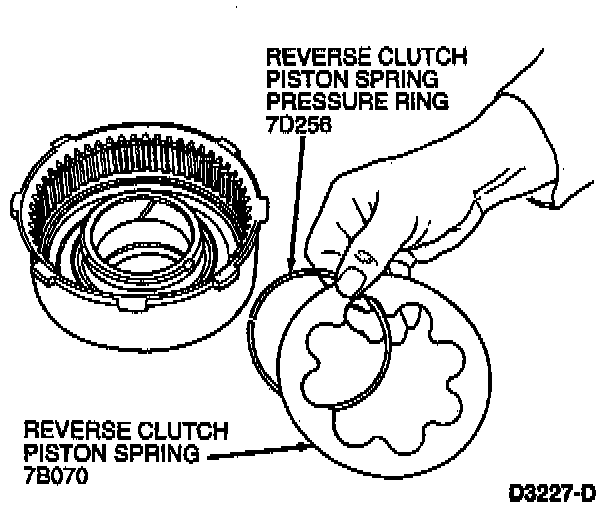 3. Install reverse clutch piston spring pressure ring and reverse clutch piston spring. The dished side of reverse clutch piston spring must face toward the reverse clutch piston.