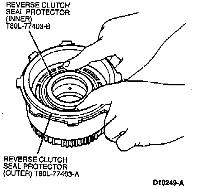 a. Install Reverse Clutch Inner Seal Protector T80L-77403-B on the clutch hub and Reverse Clutch Outer Seal Protector T80L-77403-A over the reverse clutch piston.